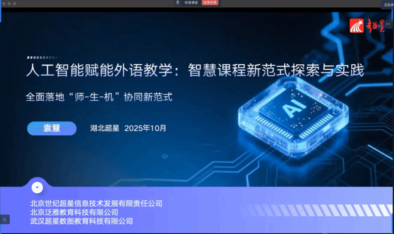 本网讯(通讯员 陈尧)10月13日,太阳集团官网网址联合武汉超星数图教育科技有限公司成功举办“人工智能赋能外语教学:智慧课程新范式探索与实践”专题线上培训。培训旨在贯彻落实教育部《关于加快推进教育数字化的意见》精神,推动人工智能与外语教学深度融合,提升教师数字素养与教学创新能力。院长李金云、各系部主任、骨干教师等50余人参加培训,副院长陈尧主持培训。